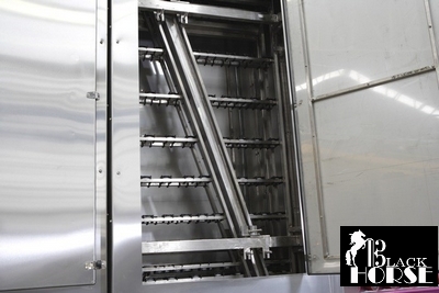 Линия мойки и прессования оборудована звукоизолированной камерой, а также стеллажом с функцией перехода из вертикального в горизонтальное положение в конце линии.