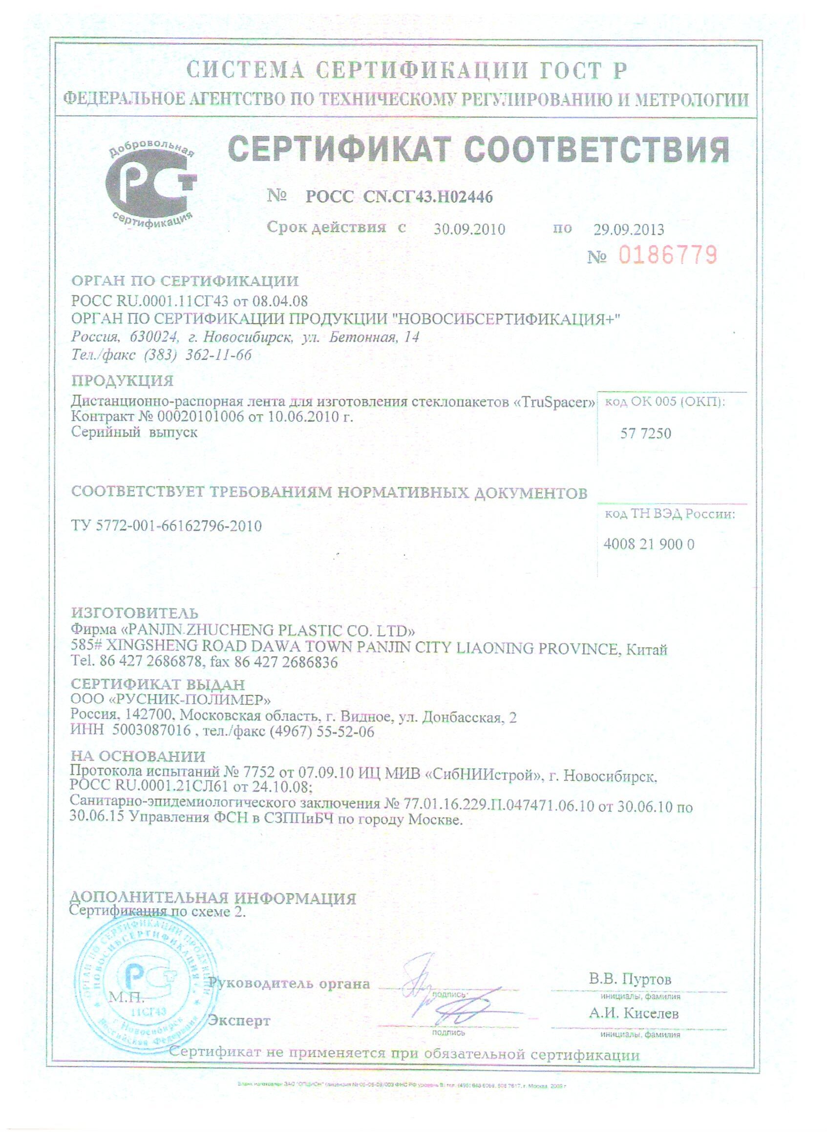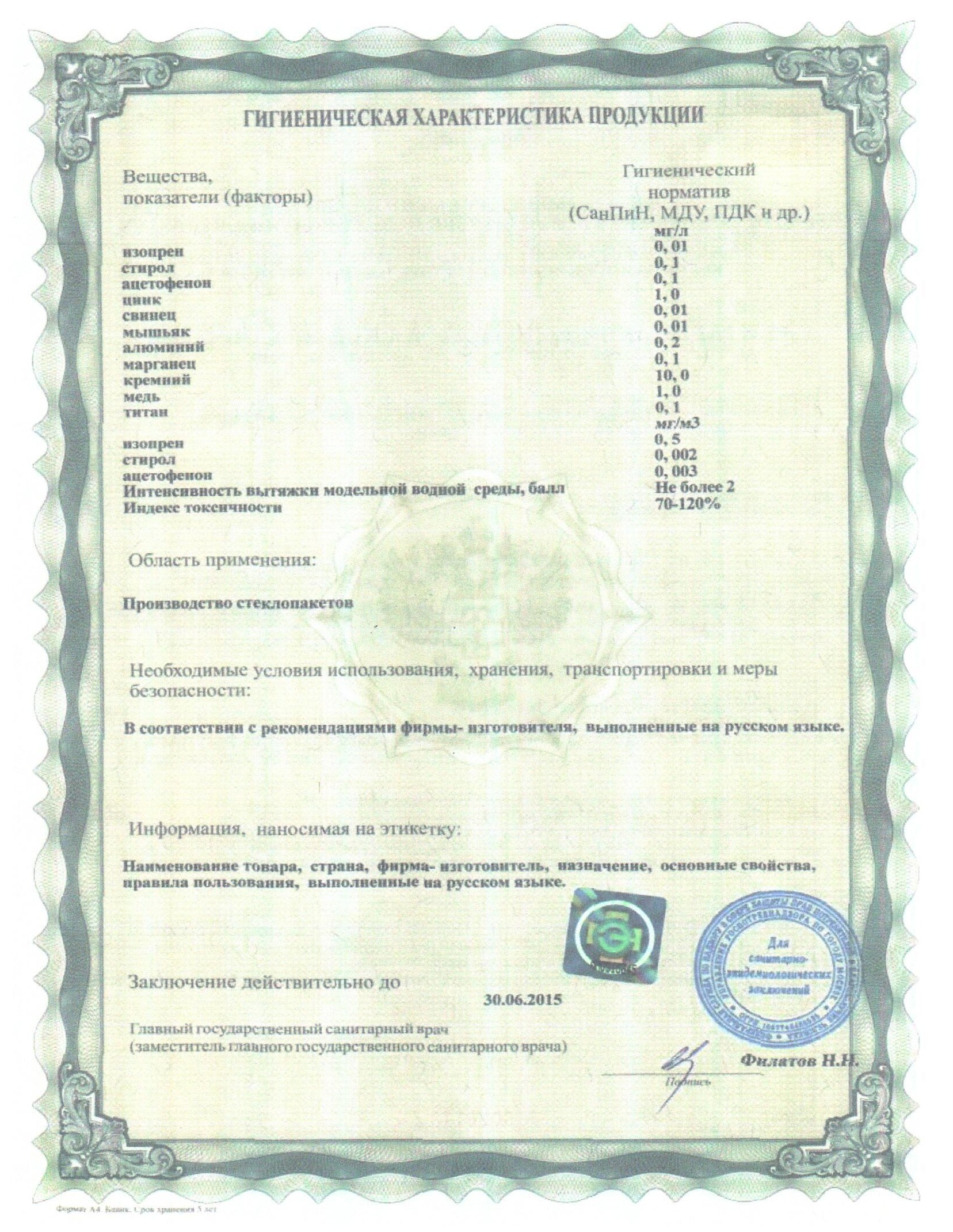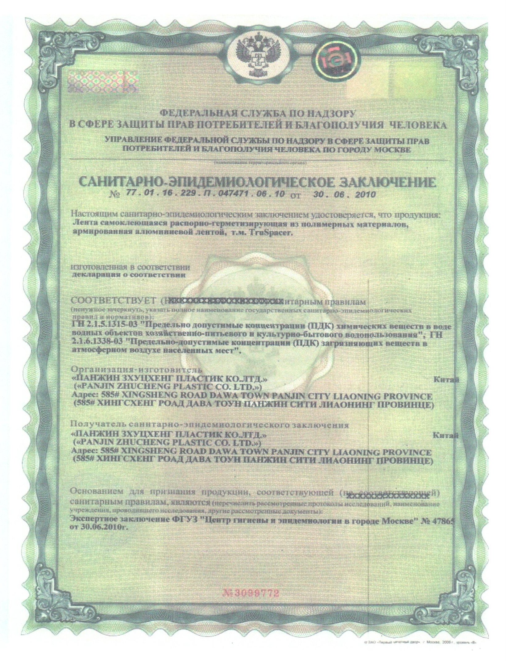 Санитарно-эпидемиологическое заключение на ленту самоклеющуюся распорно-герметизирующую из полимерных материалов, армированной алюминиевой лентой, т. м. TruSpacer