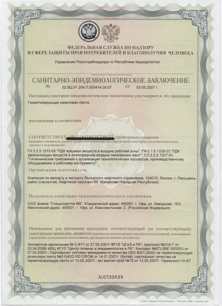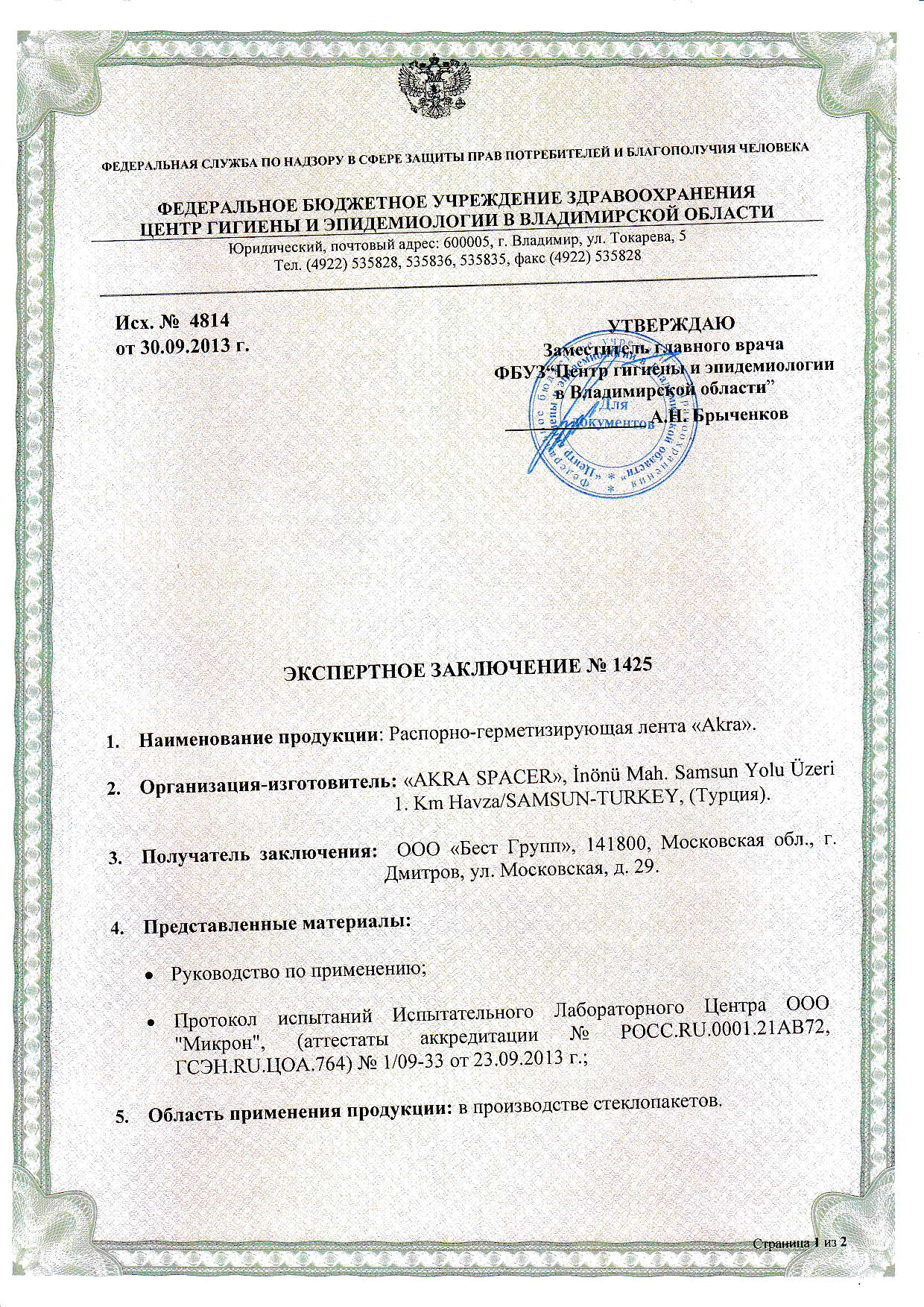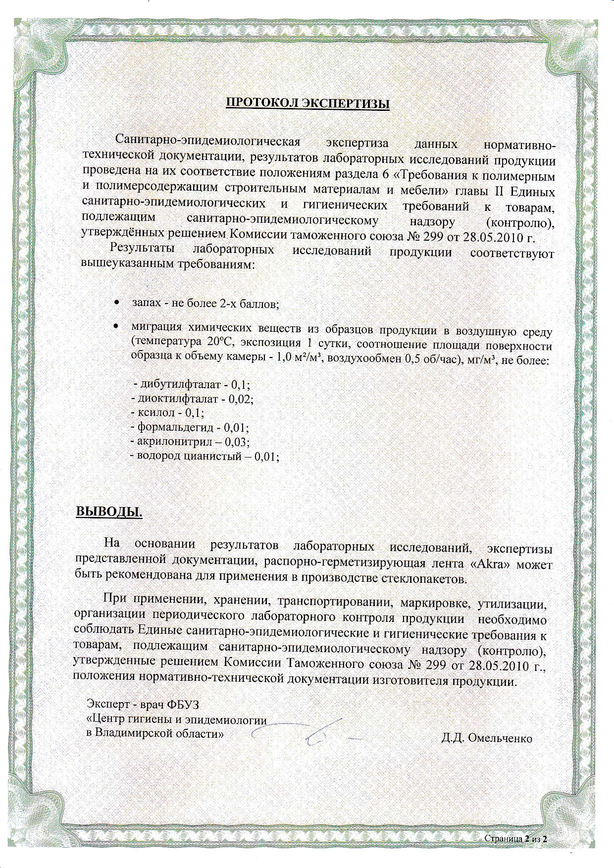 Санитарно-эпидемиологическое заключение на ленту самоклеющуюся распорно-герметизирующую из полимерных материалов, армированной алюминиевой лентой, т. м. TruSpacer