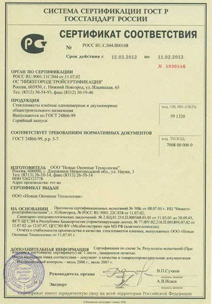 Сертификат соответствия на стеклопакеты клееные однокамерные и двухкамерные общестроительного назначения