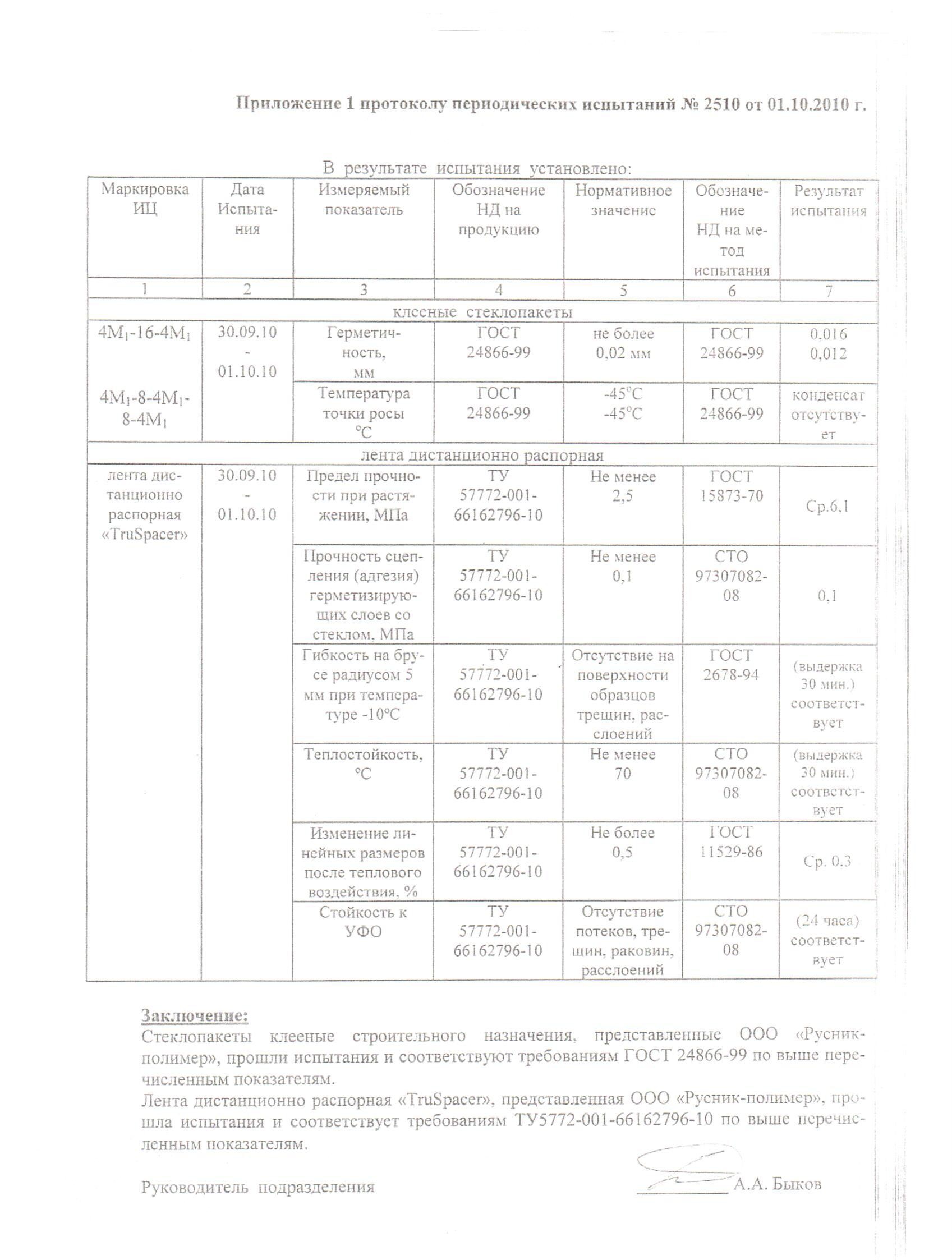 Приложение к протоколу периодических испытаний на стеклопакеты клееные строительного назначения и дистанционно распорную ленту «TruSpacer»